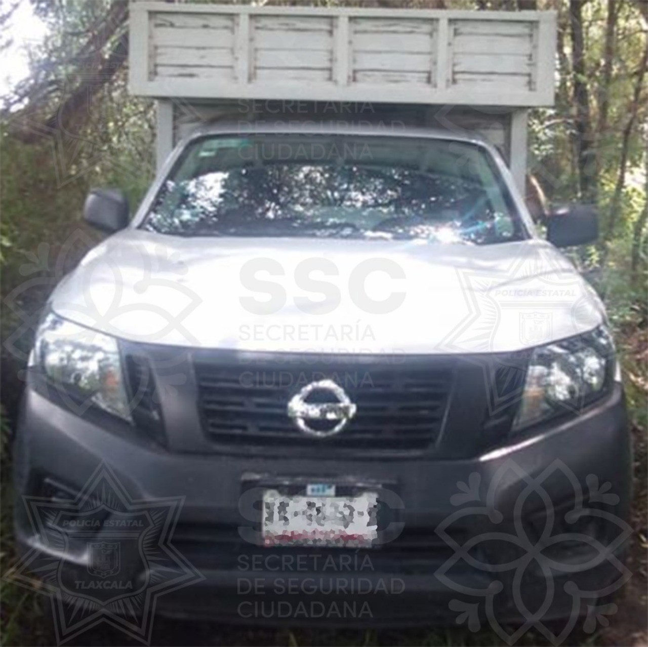 Derivado de un reporte del 911, en el cual, se informó del robo de una camioneta Nissan, línea NP300, modelo 2019, color gris y placas de circulación de Tlaxcala, los elementos estatales detectaron la unidad sobre calle Ignacio Allende, en la comunidad de Santiago Tlacochcalco; donde encontraron a una persona inmovilizada en la parte trasera.