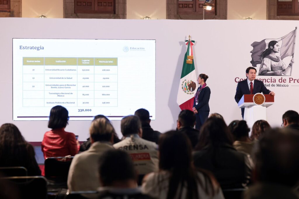 - Se habilitarán 150 mil nuevos lugares en la Universidad Rosario Castellanos; 25 mil en la Universidad de la Salud; 40 mil en las Universidades para el Bienestar Benito Juárez García; 85 mil en Tecnológico Nacional de México y 30 mil en el Instituto Politécnico Nacional.