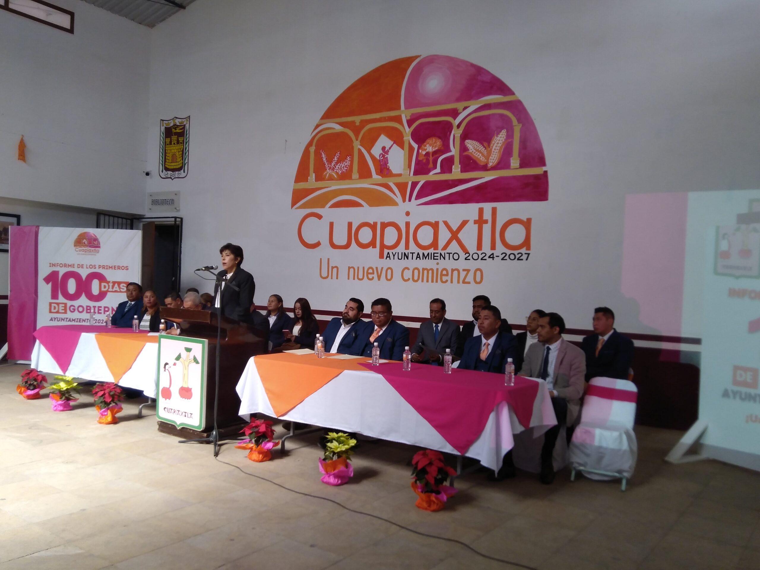 Este sábado 21 de diciembre del año en curso, se llevó a cabo en el Municipio de Cuapiaxtla el Informe de Actividades a 100 Días de inicio de la presente administración, que preside Alma Lorena Escobar González, quien en su mensaje destacó las diversas actividades que se han realizado en las diversas áreas del ayuntamiento.