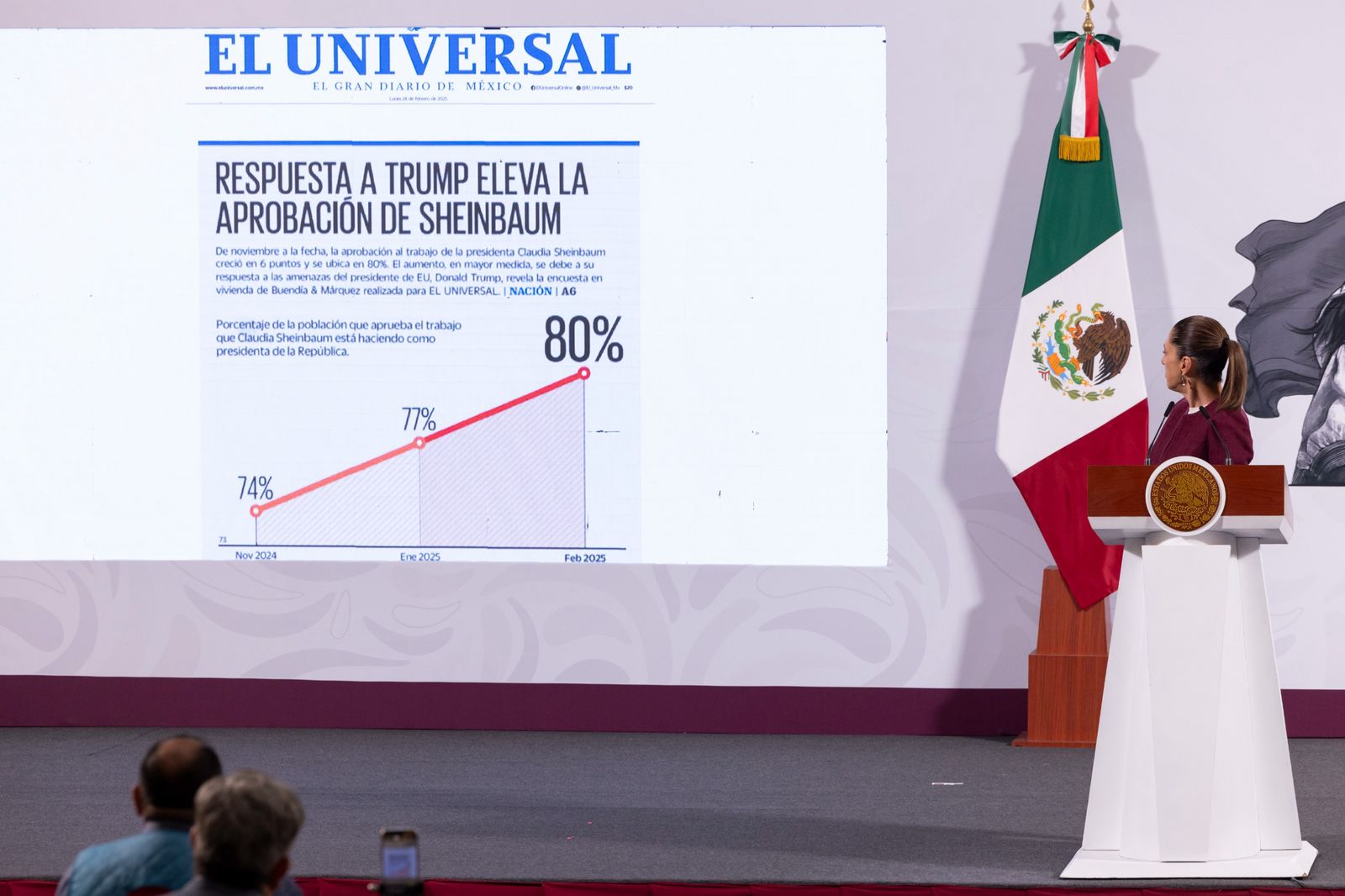 La Presidenta de México, Claudia Sheinbaum Pardo, celebró y agradeció al pueblo de México por el 80 por ciento de aprobación a su gobierno de acuerdo con en la última encuesta realizada por Buendía & Márquez para El Universal.