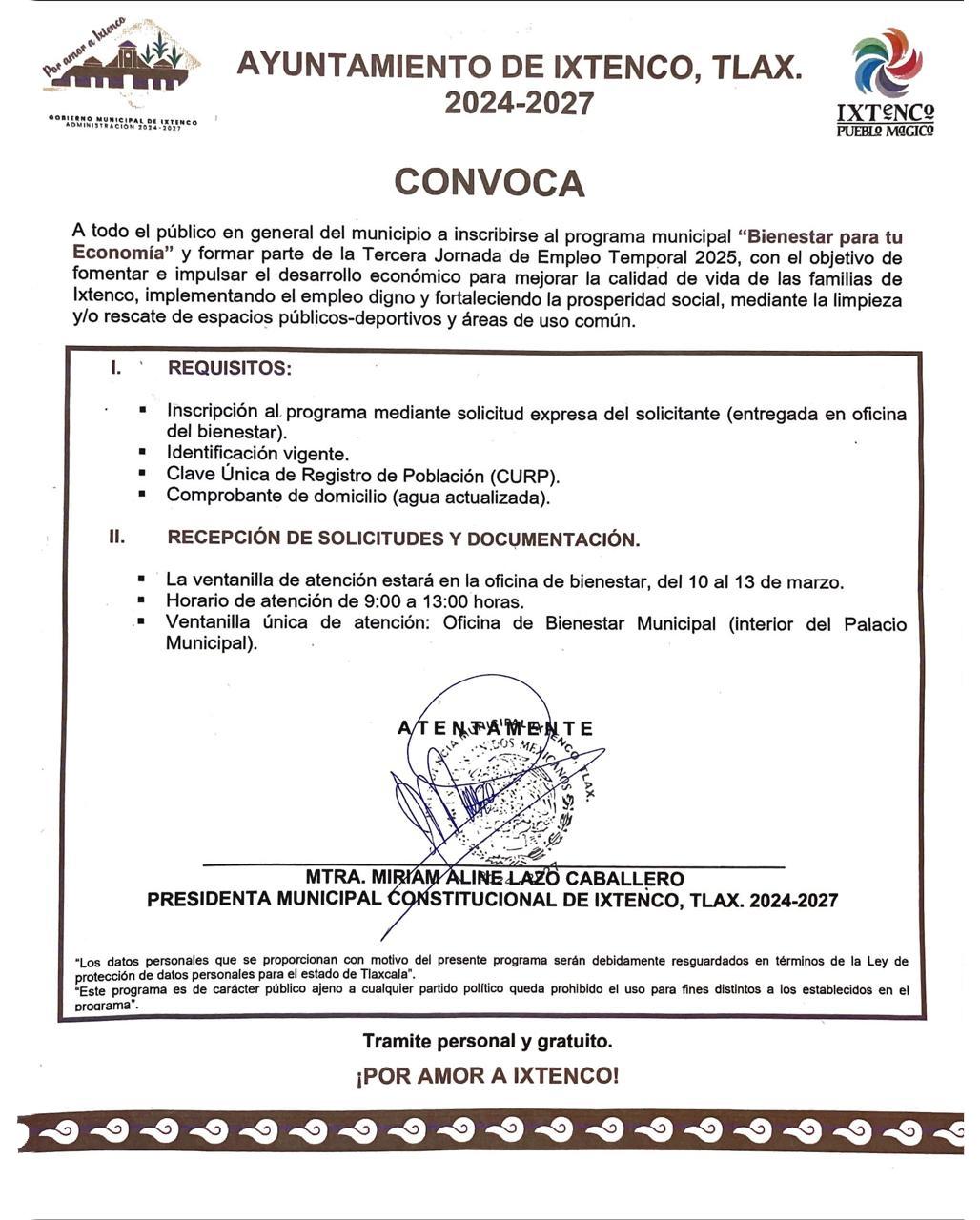 Con el firme compromiso de impulsar el empleo digno y fortalecer la recuperación de espacios públicos en la comunidad, el H. Ayuntamiento de Ixtenco, encabezado por la Presidenta Municipal Miriam Aline Lazo Caballero, hace una cordial invitación a la población para participar en la Tercera Jornada de Empleo Temporal 2025, en el marco del programa “Bienestar para tu Economía”.