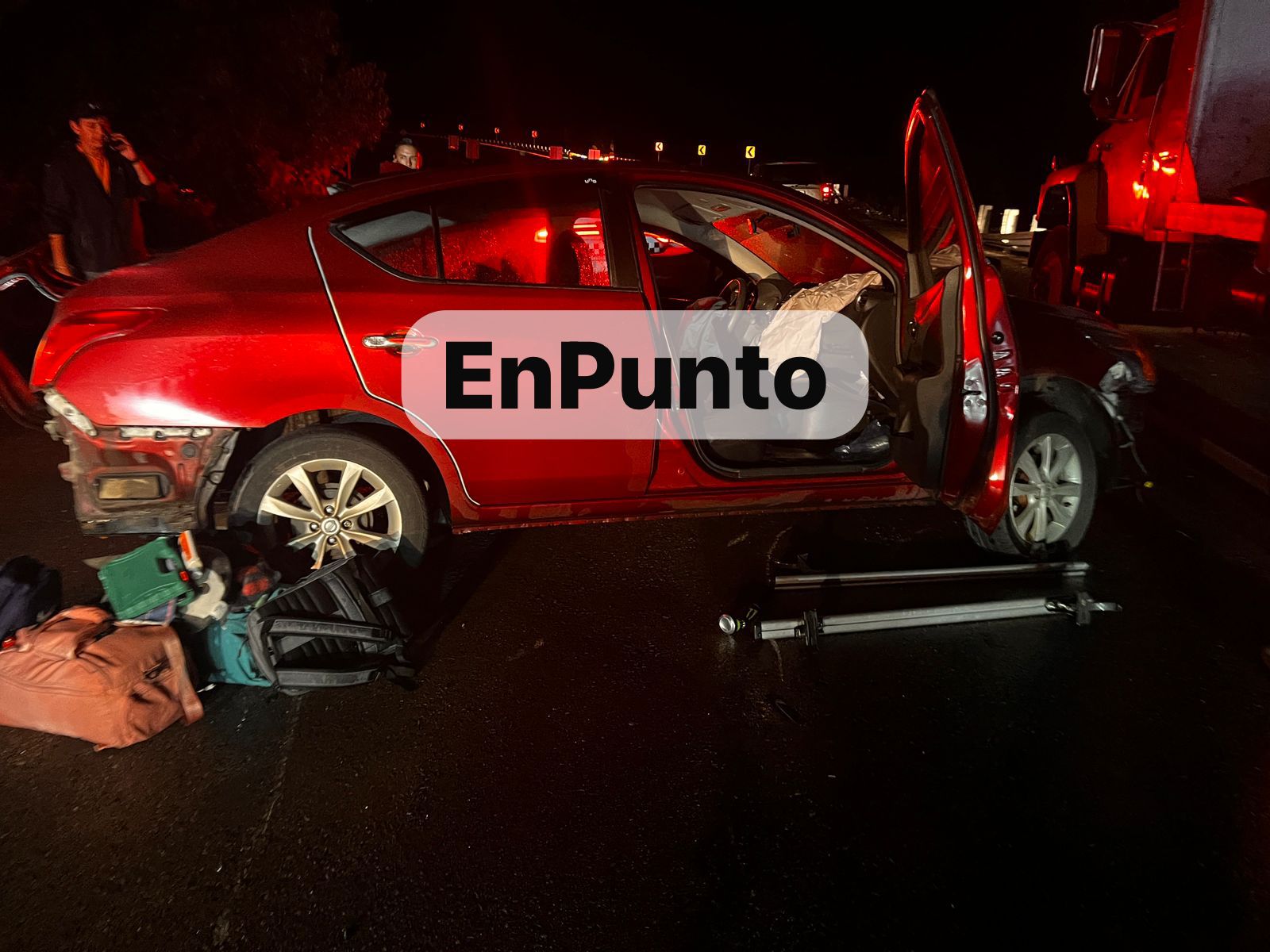 En información preliminar, el conductor de la unidad perdió el control de la misma, presuntamente por el asfalto mojado, impactó el vehículo compacto color rojo en el que viajaban contra el muro de contención.
