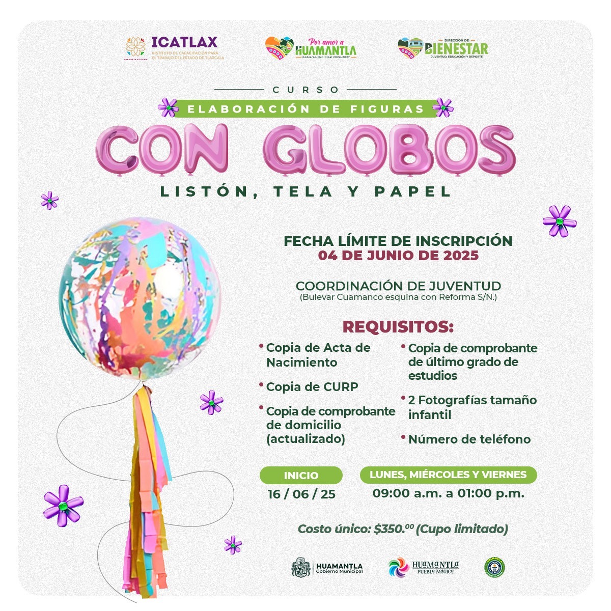 A fin de generar oportunidades de crecimiento económico y profesional, el Gobierno Municipal de Huamantla invita a la comunidad interesada, a participar en el curso de decoración con globos, listón, tela y papel, enfocado en la creación de arreglos para graduaciones que ofrecerá el Instituto de Capacitación para el Trabajo del Estado de Tlaxcala (ICATLAX).