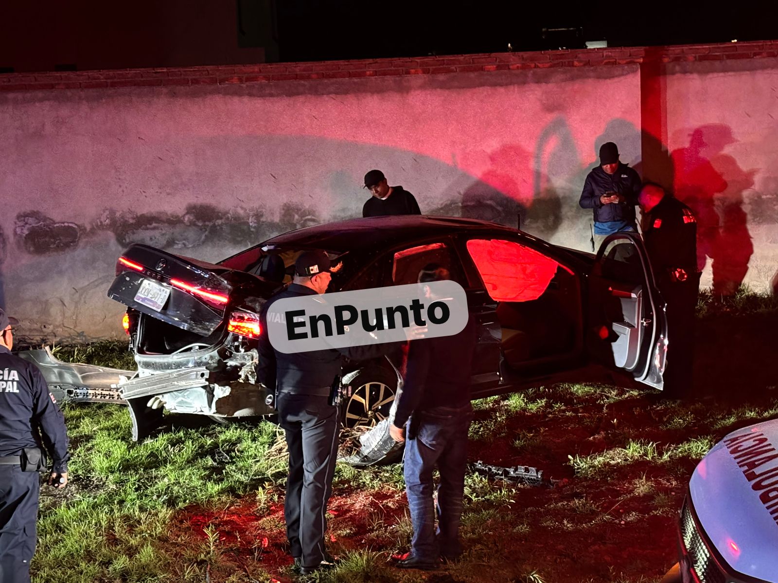 Derivado del percance, derribó parte de la barda de un fraccionamiento privado, en tanto la unidad quedó completamente destrozada.
