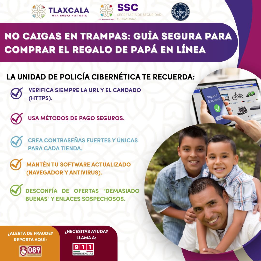 Con motivo del Día del Padre y el aumento de compras en línea durante esta temporada, la Secretaría de Seguridad Ciudadana (SSC) a través de la Unidad de Policía Cibernética, da a conocer una serie de recomendaciones para prevenir fraudes y proteger a las familias tlaxcaltecas durante sus transacciones en línea.