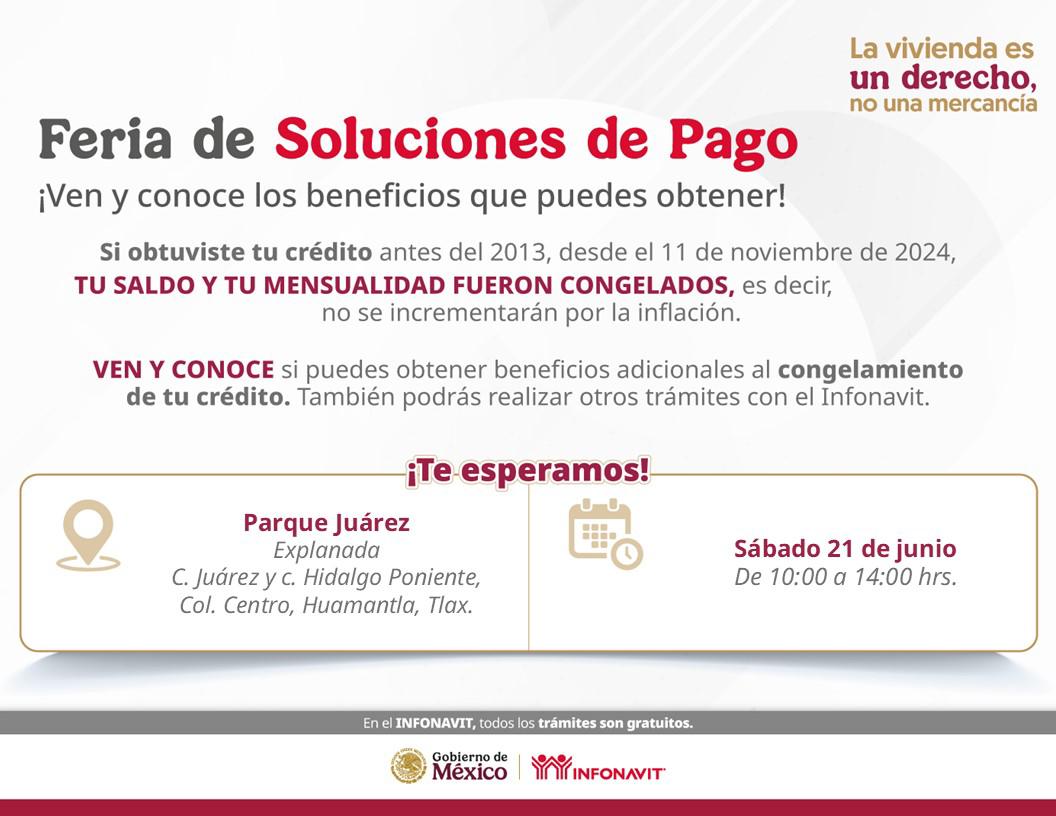 En un esfuerzo coordinado entre el gobierno municipal de Huamantla y el Instituto del Fondo Nacional de la Vivienda para los Trabajadores (Infonavit), este sábado 21 de junio se llevará a cabo la Feria de Soluciones de Pago, una estrategia institucional que busca acercar servicios, trámites y asesorías personalizadas a las y los trabajadores de la zona oriente del estado.