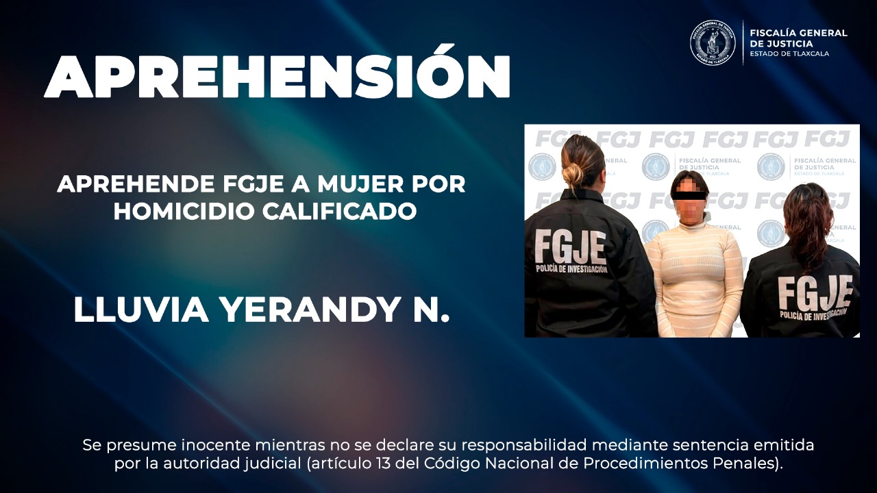 La Policía de Investigación de la Fiscalía General de Justicia del Estado (FGJE) realizó labores de inteligencia, campo y gabinete que derivaron en la aprehensión de Lluvia Yerandy N., por el delito de homicidio calificado.