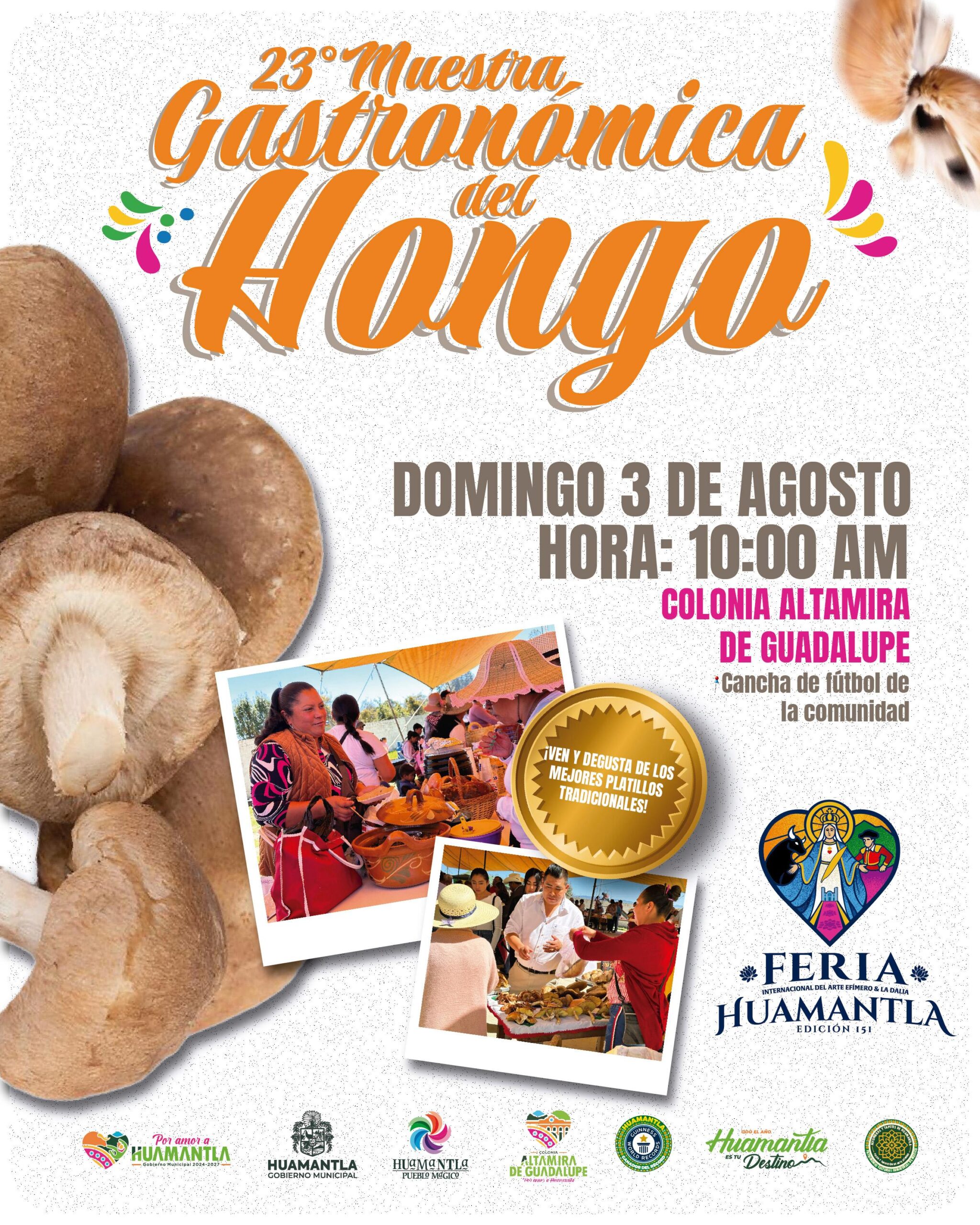 El Ayuntamiento de Huamantla invita a todos los amantes de la gastronomía y la cultura a la 23° “Muestra Gastronómica del Hongo”, evento que se llevará a cabo el próximo domingo 03 de agosto a las 10:00 horas en la cancha de fútbol de la comunidad de Altamira de Guadalupe.