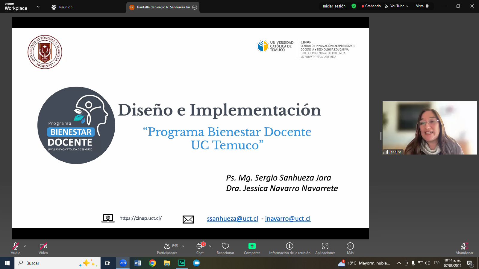 Dando continuidad a las actividades de la Jornada de Formación y Profesionalización Docente Otoño 2025, que lleva a cabo la Unidad Institucional de Profesionalización Docente de la Universidad Autónoma de Tlaxcala (UATx), se impartió la conferencia virtual “Programa de Bienestar Docente”, a cargo de la Doctora Jessica Lorena Navarro Navarrete y del Doctor Sergio Rodrigo Sanhueza Jara, ambos catedráticos de la Universidad Católica de Temuco, Chile (UCT).
