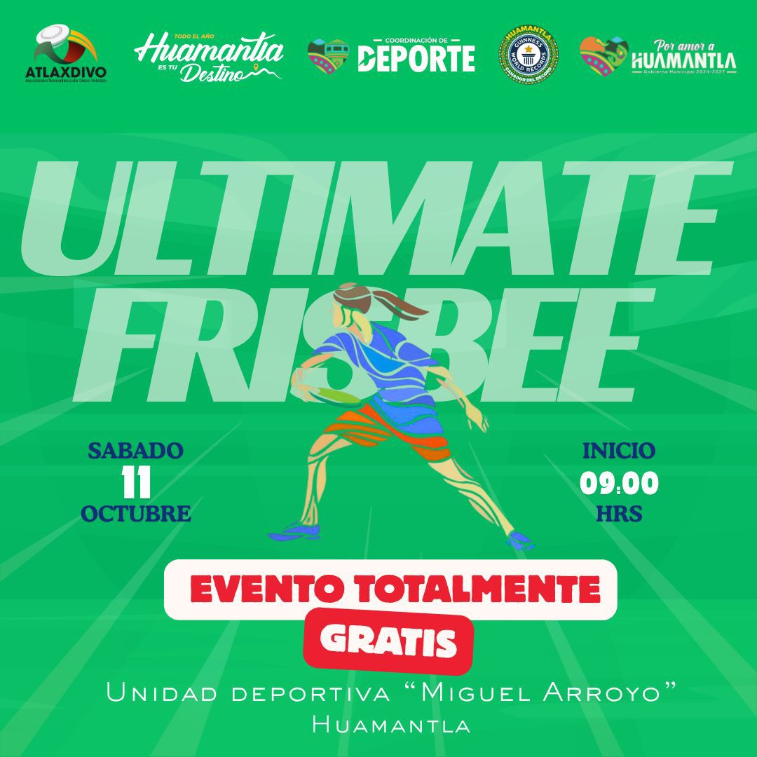 Con el objetivo de fomentar la práctica de nuevas disciplinas deportivas y promover la sana convivencia entre familias y comunidades, el Honorable Ayuntamiento de Huamantla, a través de la Coordinación Municipal del Deporte, invita a maestras, maestros de educación física, estudiantes y al público en general a participar en la Clase Gratuita de Ultimate Frisbee.