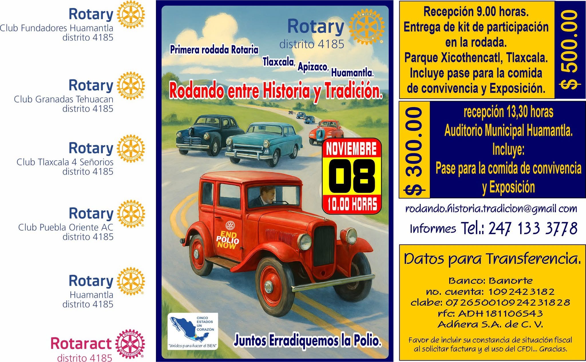 Leonardo Vicente Sánchez Martínez, Presidente del Club Rotario Fundadores Huamantla, dio a conocer que se tiene todo listo para la rodada de autos y motocicletas denominada “Rodando entre historia y tradición”, proyecto en contra de la polio.